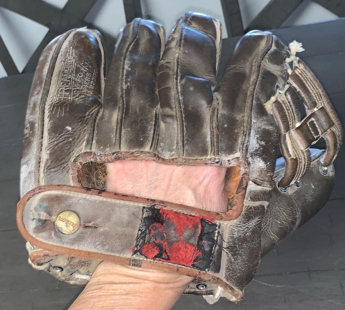 A 1920's sewn web glove sold for $75. Stamped Genuine Horsehide. There is a mfg. name in an oval below but I can't make it out. The glove looks well made.