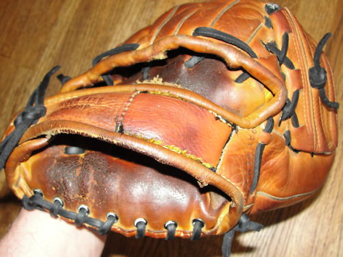 An interesting glove recently sold on ebay. it's a circa 1964 Wilson Al Kaline model A2224. It features finger loops at the beginning of the finger stalls so a player could partially insert his hand and still have control of the glove and thereby increase his fielding range. I couldn't find this model in a catalog. Maybe Derek knows more about this. The glove is a nice one.