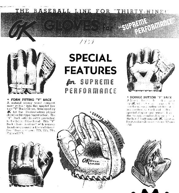 Ohara won his suit against Wilson and Wilson appealed the ruling. The judges ruled the Wilson design an improvement but because of historical precedent it was declared not a patentable invention. The other glove manufactures were free to continue their own version of the curved finger glove despite Wilson's attempt to monopolize the design. A curved back glove is shown below in this 1939 OK catalog