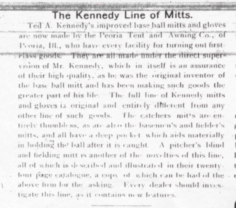 "Ted A. Kennedy's improved base ball mitts and gloves are now made by the Peoria Tent and Awning Co., of Peoria, Ill., who have every facility for turning out first class goods. They are all made under the direct supervision of Mr. Kennedy, which in itself is an assurance of their high quality, as he was the original inventor of the base ball mitt and has been making such goods the greater part of his life. The full line of Kennedy mitts and gloves is original and entirely different from any other line of such goods. The catchers mitts are entirely thumbless, as is also the basemen's and fielder's mitts, and all have a deep pocket which aids materially in holding the ball after it is caught. A pitcher's blind and fielding mitt is another of the novelties of this line, all of which is described and illustrated in their twenty four page catalogue, a copy of which can be had of the above firm for the asking. Every dealer should investigate this line as it contains new features."