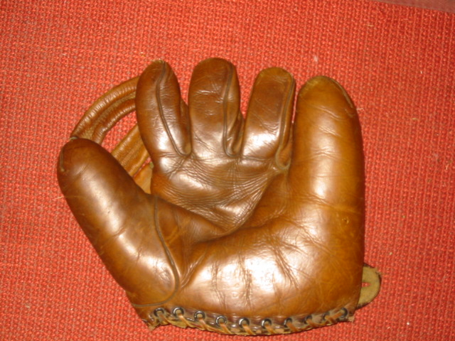 Found this at a Labor Day street fair. Rawlings Bill Doak, Model H, military issue, left hand thrower. Unfortunately the lining is cracked and piping is worn, but the front is very nice with strong stampings. Paid a whopping $10 for it.