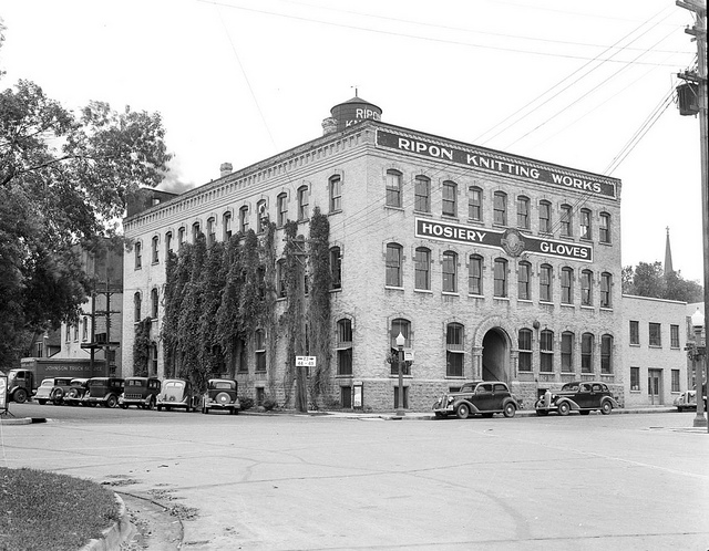 Boxes marked "Ripon Knitting Works" out for delivery looks kind of precarious.