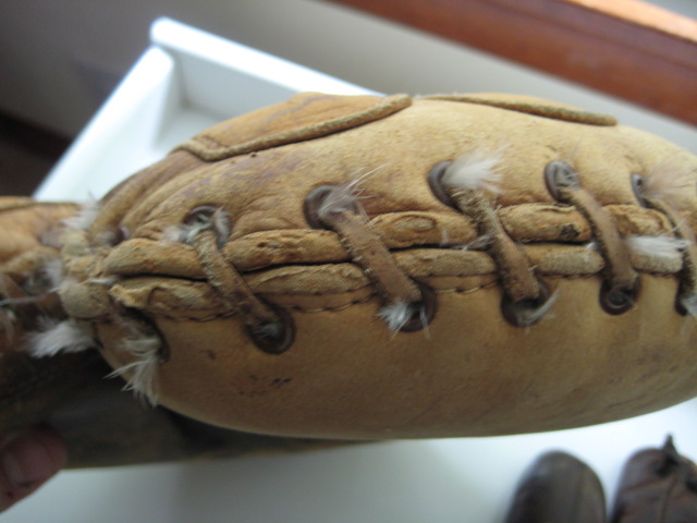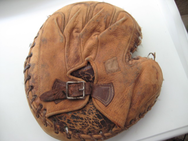 The first glove I bought was a Spalding catchers mitt Player's Choice Model# S. It's in pretty good shape the tag is faded but intact and the buckle strap is strong and not detached. The leather is a little dry but I bet a good conditioning will really bring it back to life. One weird thing is that it seems to be shedding feathers. Is this something the manufacturers filled the gloves with back in the day or do you guys think it was later addition? By the way Brett I bought this off a guy named Phil and he told me to tell you Hi.