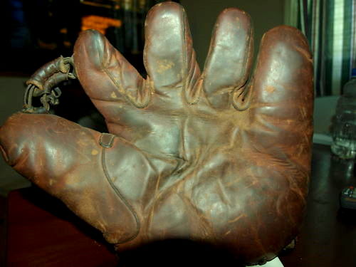 Some pretty good gloves. A nice 1920's Reach model OOW with patented strap web joining thumb and first two fingers sold for $89 on ebay. Intricate web lacing and grommets in good shape. Leather piping and lining intact. Super cloth patch