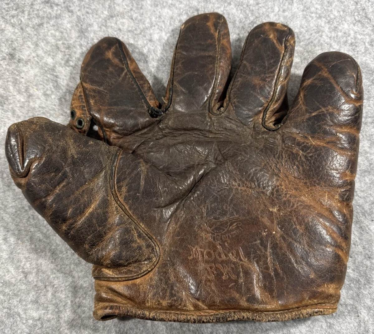 A 1924 Victor, Wright & Ditson model FW "Muny League" glove sold for $75. A real solid example. Nice factory stamps on the heel and a super cloth patch. I like the adjustable sewn web.