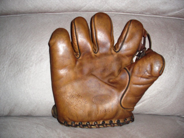 I have for sale a lefty JC Higgins Travis Jackson model 1698 for sale. The glove is in good condition and has very strong stampings. The lining is soft with minor wear. Tall adult size glove. The piping shows the most wear and is flaking in some places. The glove will go to the first reasonable offer. Interested email me at jrmaddux@my.trine.edu.