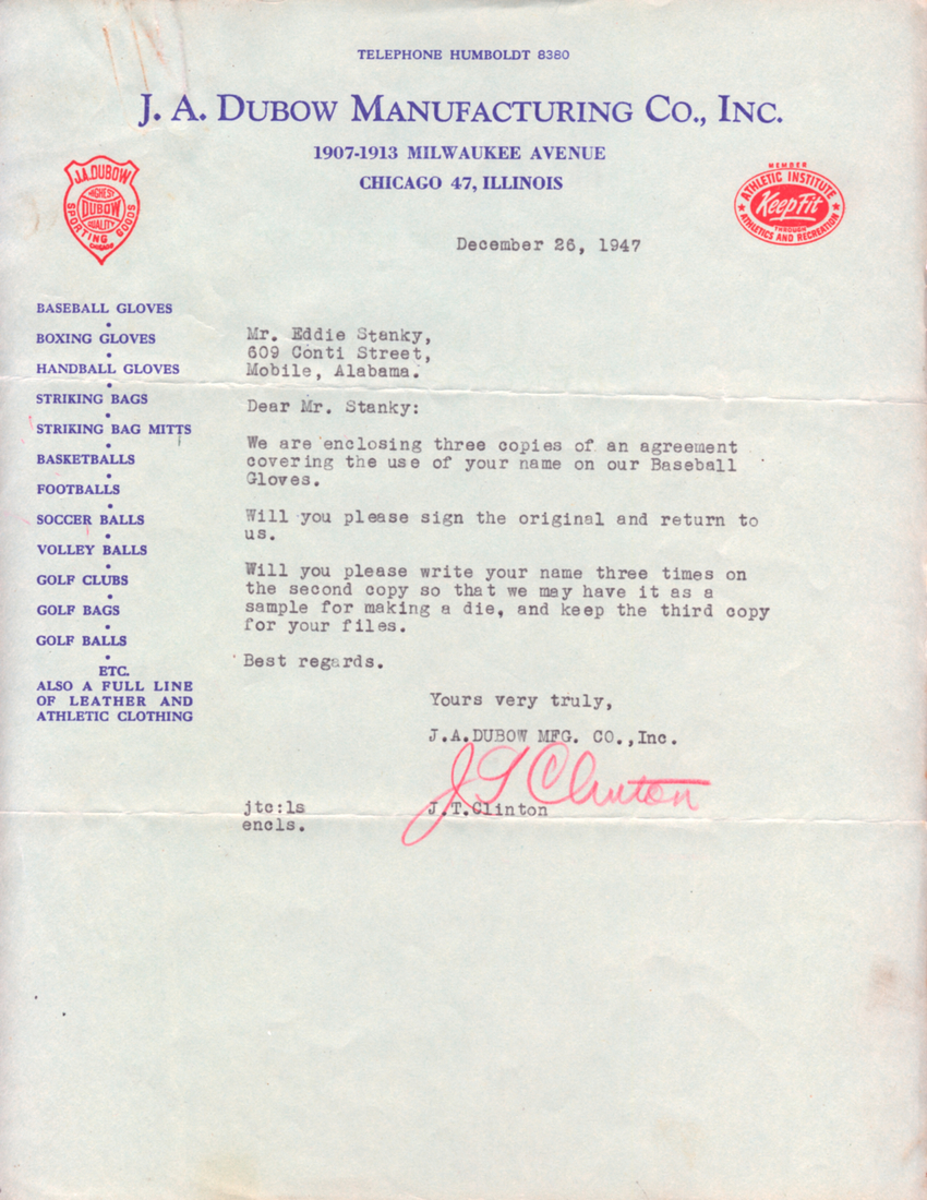 In the lot with the Sonnett letters I posted about in a different thread, there was also a glove/letter from Dubow and Stall & Dean. Both are great but they don't really fit my collection and I'd like to pass them onto someone who will appreciate them more. The Dubow glove and letter are from the late 1940's. Glove is large and shows little to no use. The leather is dry and could use some conditioning. It will come with a letter from the Dubow company as well as a copy of a glove contract. The Stall & Dean glove is from the 1950's and is a Stanky Special. The letter is signed by Dick Stall and comes with an envelope addressed to Mr. Stanky. The top lace in the glove is broken and the glove needs a good conditioning.