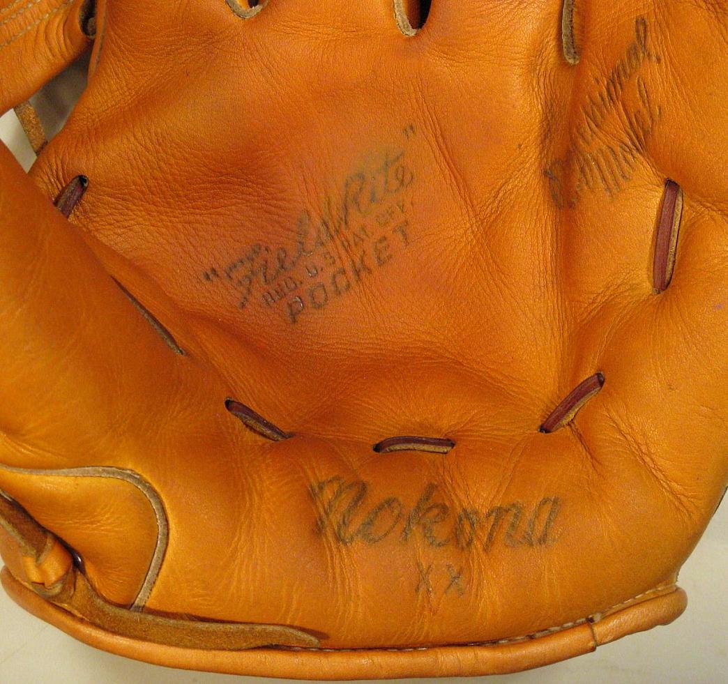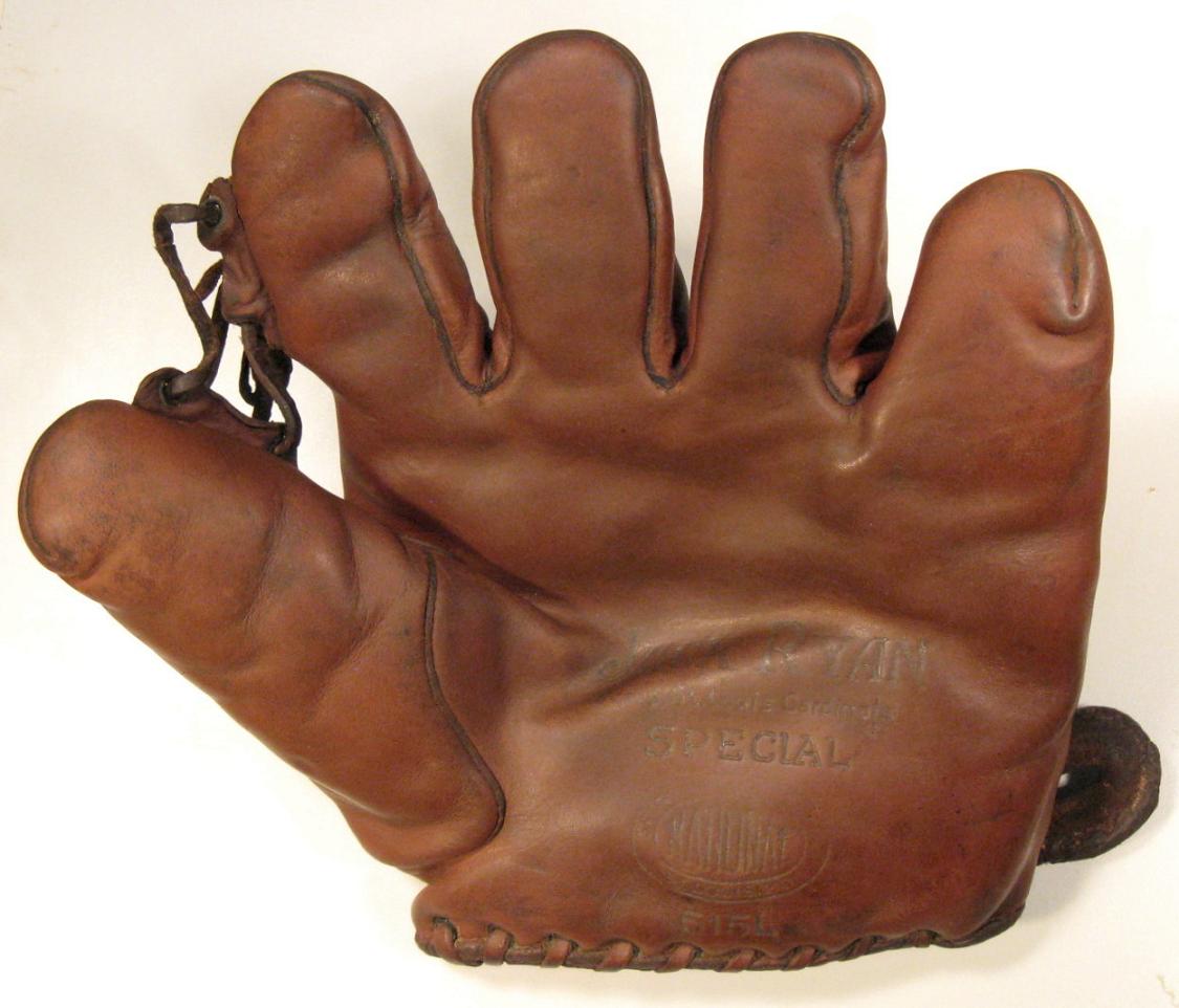 A rare National brand "Jack Ryan Special" glove. He was a scout for the St. Louis Cardinals and was part of Branch Rickey's Knot Hole Gang Promotion in the 1920's. Pretty cool glove with great markings on the front. Full size, high quality grommet web model.