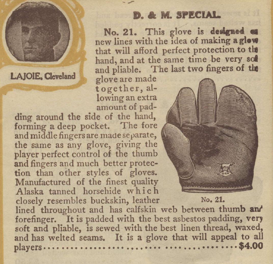I wish I could say I've owned one of those early Wilson out-seam gloves but it hasn't happened yet. Here is a nice cover and page from a 1911 D&M catalog that recently sold. The full web, three finger model would be a nice find. The whole catalog is available for download at